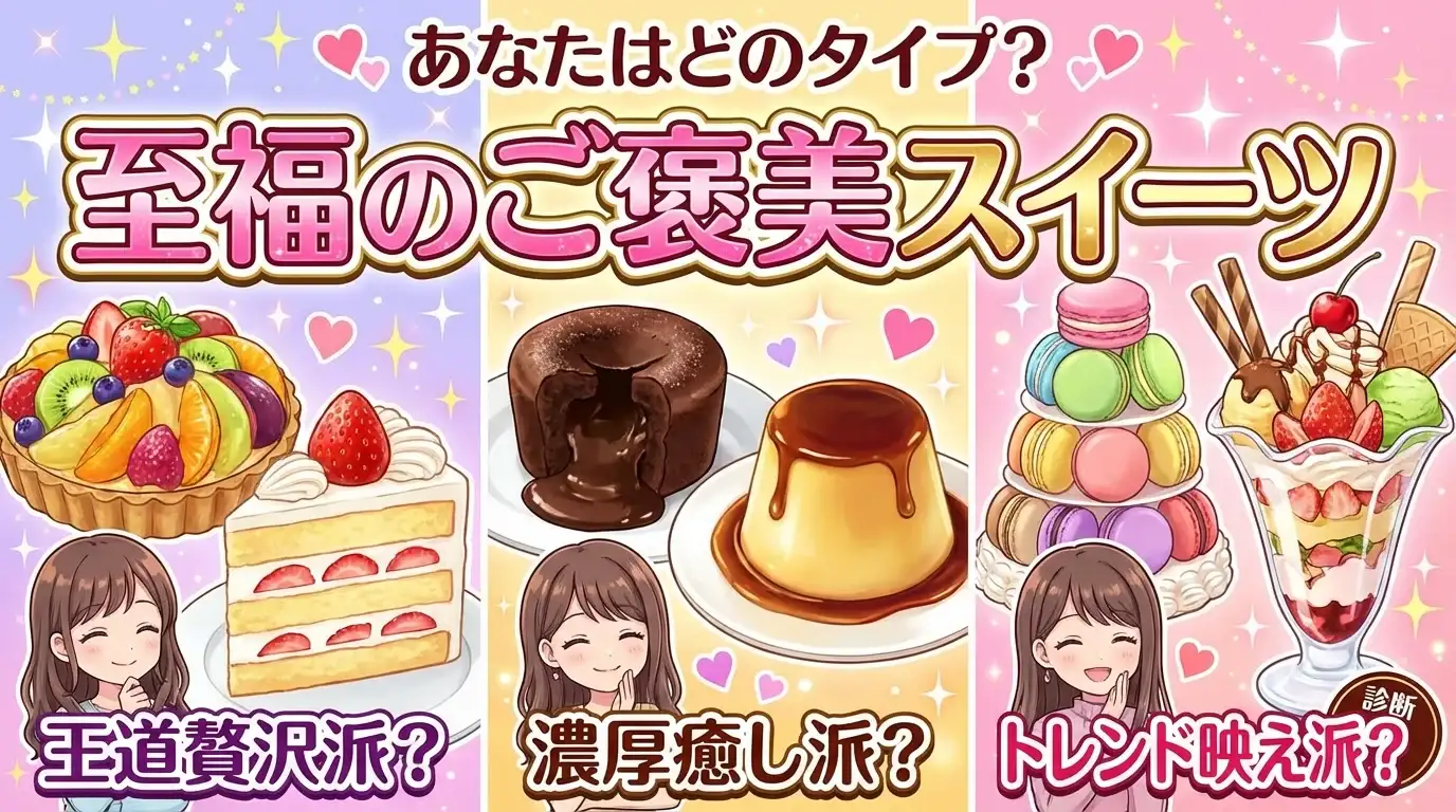 頑張った自分へのご褒美に、最高のスイーツを。あなたの隠れた性格や今日の気分を診断し、心ときめく特別なご褒美スイーツを提案します。さあ、甘い癒やしの扉を開いてみませんか?