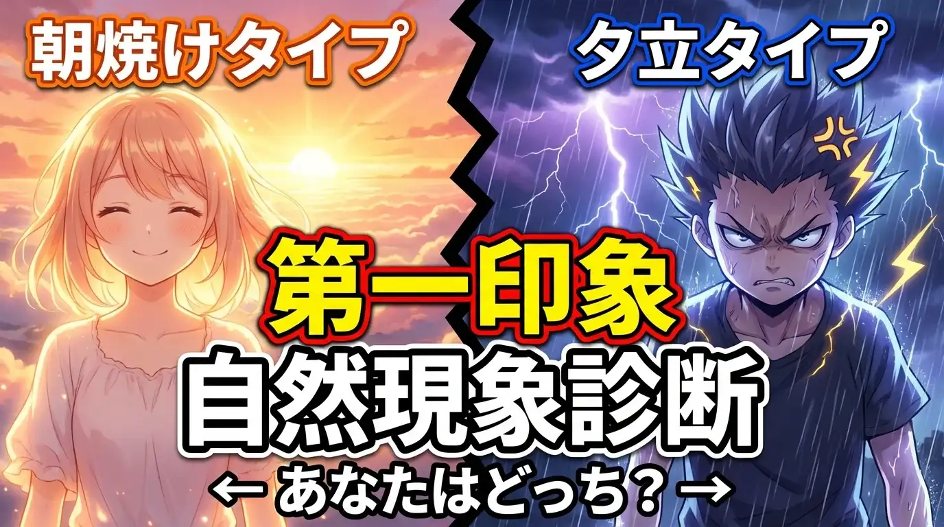 あなたの第一印象は、穏やかな朝焼け?それとも鮮烈な夕立?この診断で、あなたが他人にどう映るか、自然現象に例えて明らかにします。