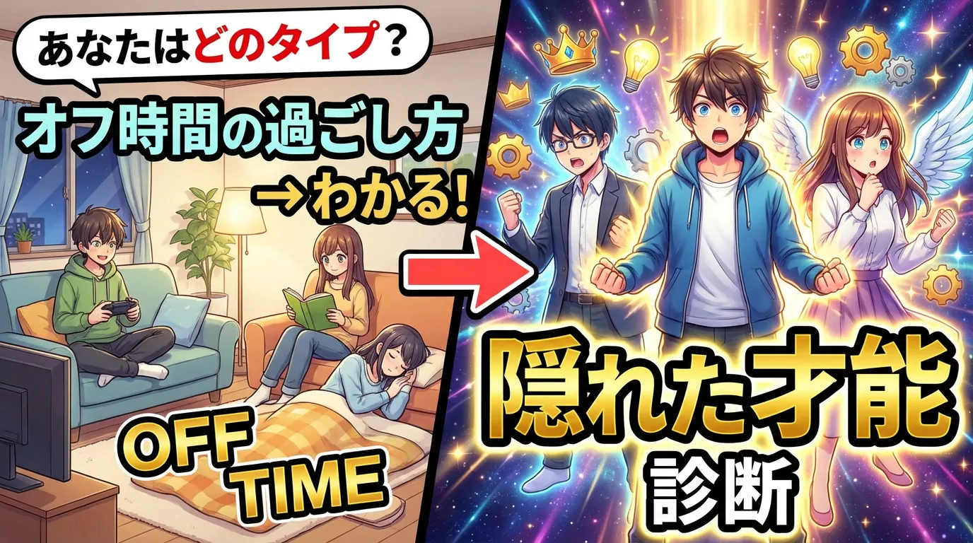 あなたのオフ時間の過ごし方から、秘められたユニークな才能や強みを診断します。あなたが気づいていない、隠れた魅力を発見しましょう!