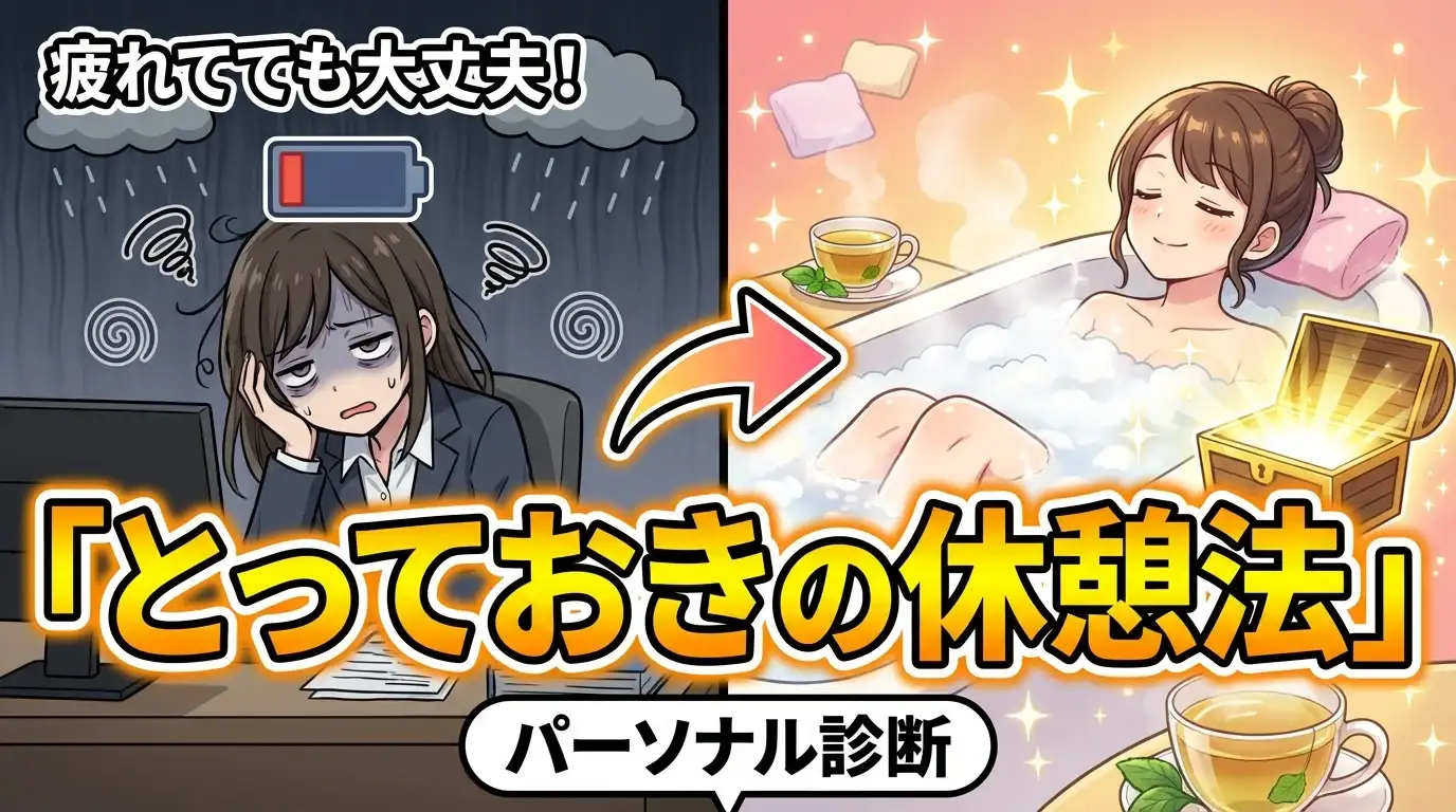 仕事や家事で疲れているあなたにぴったりの休憩法を診断します。心と体をリフレッシュする秘訣を見つけて、明日からの活力をチャージしましょう!
